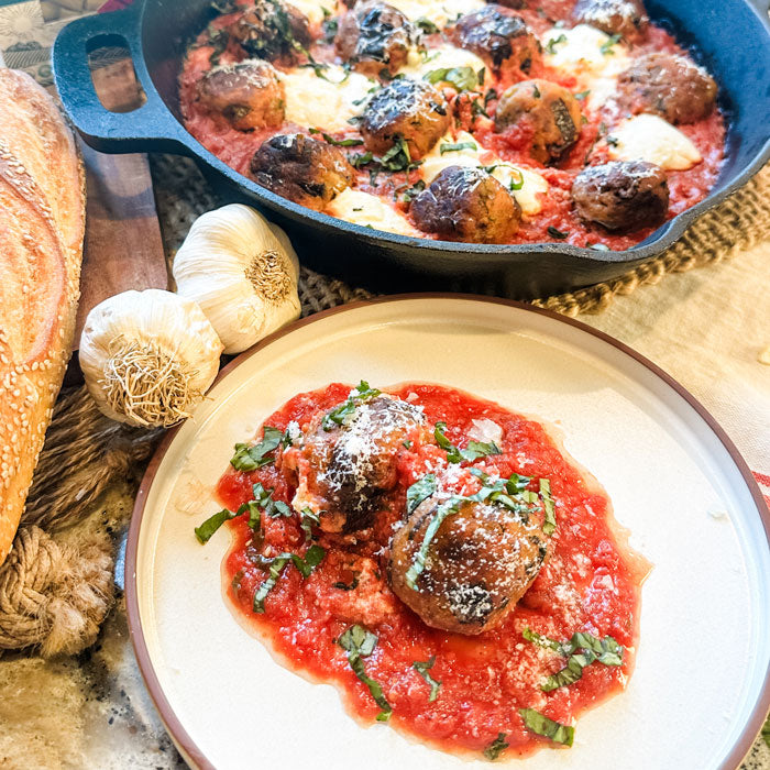 - Next coat a large cast iron or oven-safe dish with the tomato sauce. Add in the meatballs, leaving about an inch of space between.