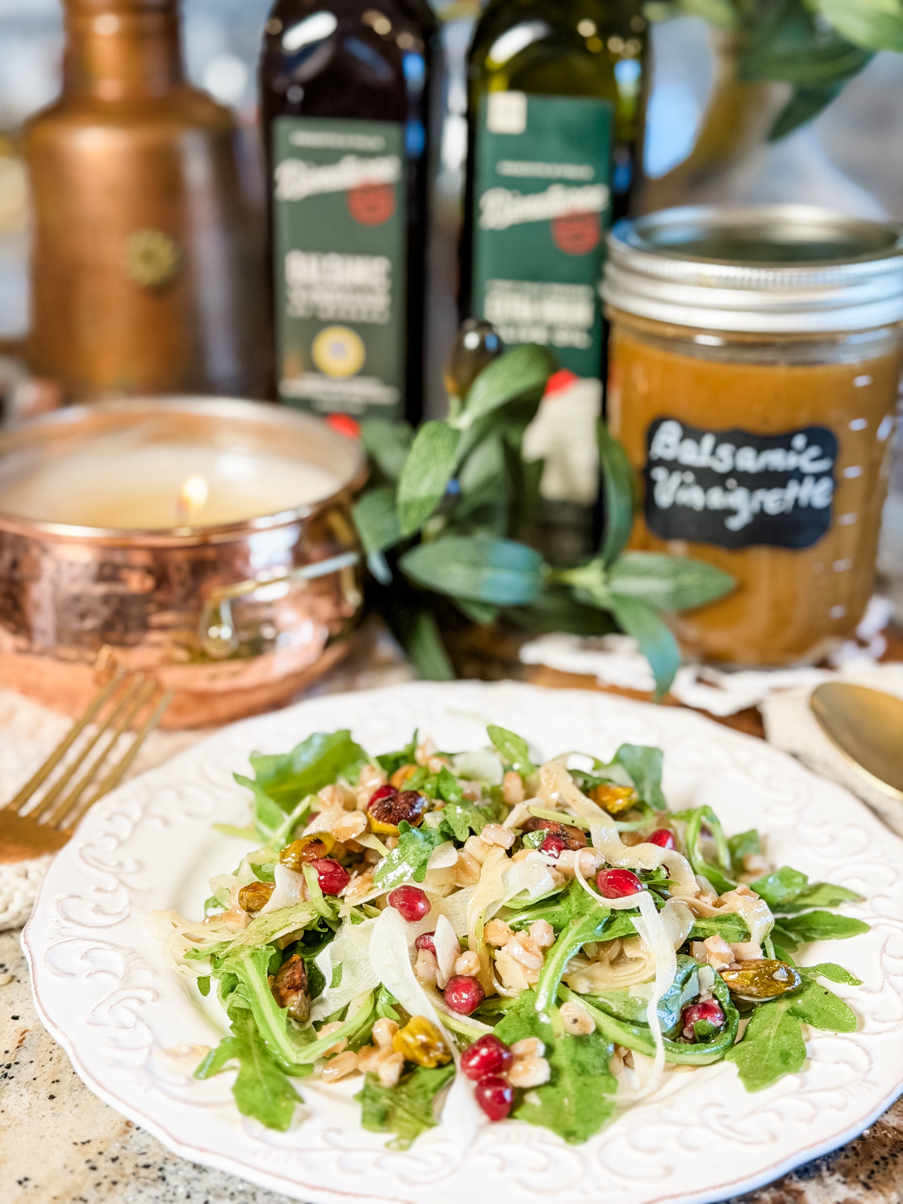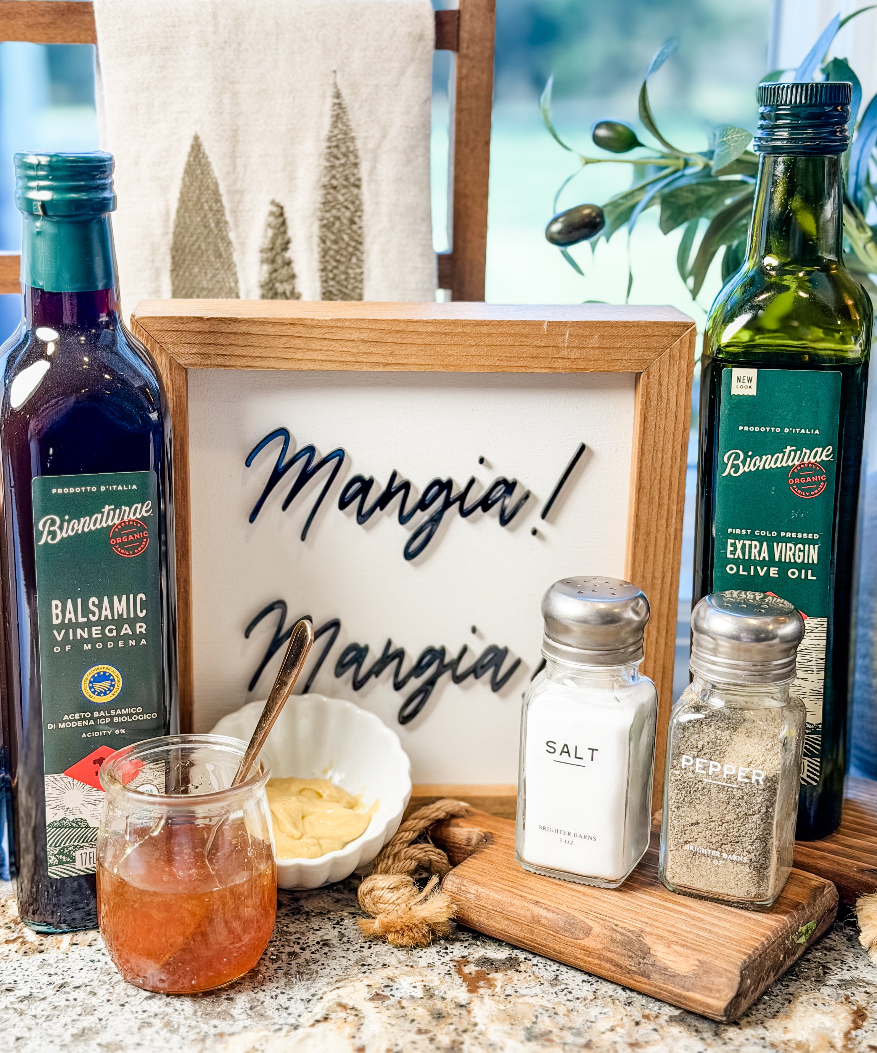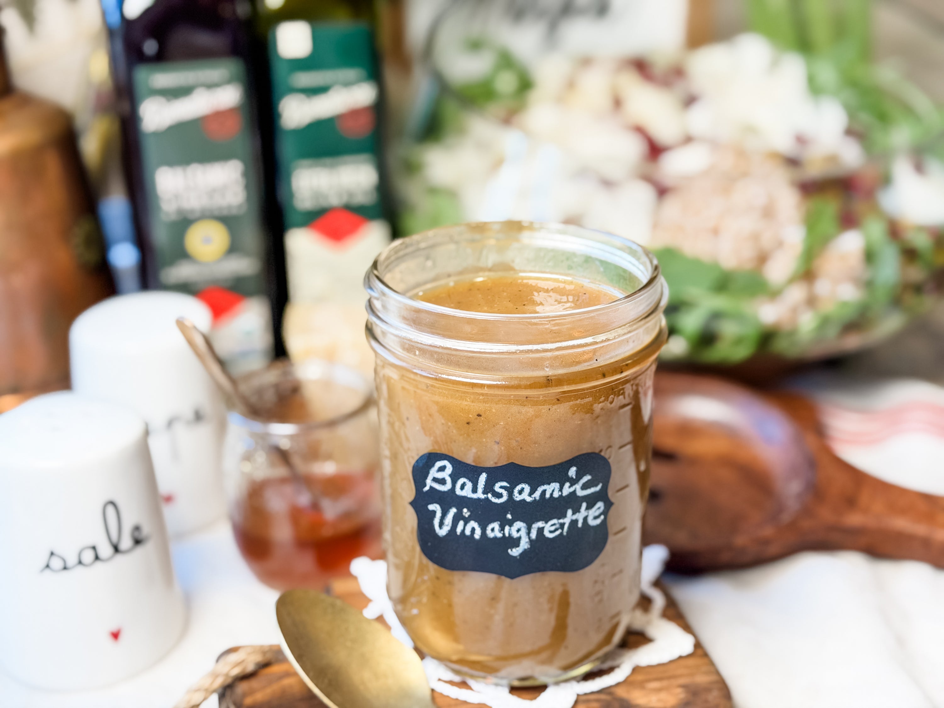 - In a small jar (or blender) add the balsamic, Dijon mustard, honey, salt and pepper.