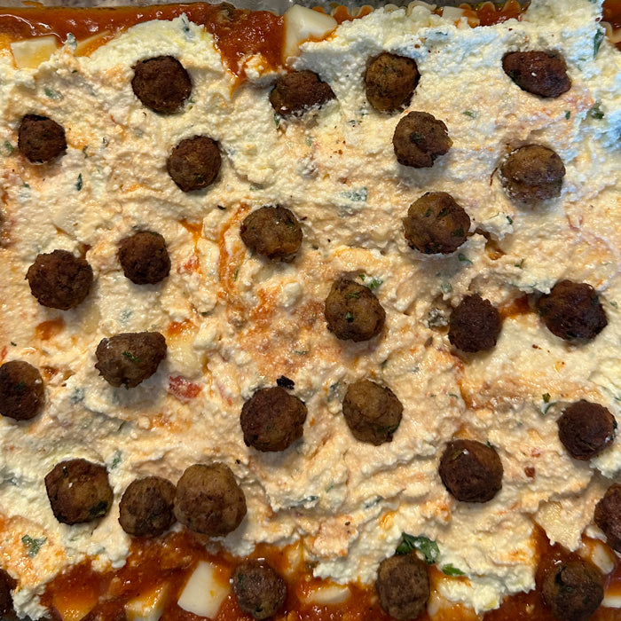 First, spread sauce on the bottom of the pan. Then add a single layer of the lasagna noodles, then sauce, the mozzarella, ricotta mixture, and mini meatballs. Continue to layer in this manner until all the ingredients are finished. Top the lasagna with some more sauce, grated Pecorino, and mozzarella.