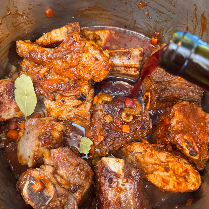 - Deglaze with Red Wine: Pour in the red wine, scraping the bottom of the pot to release the browned bits.