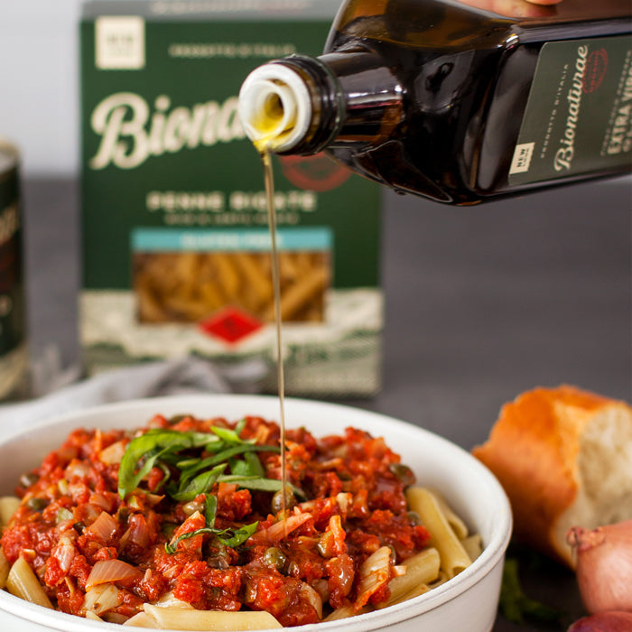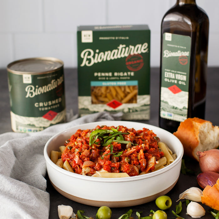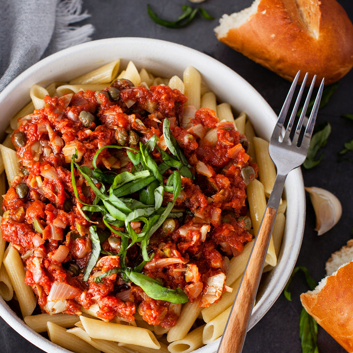 Recipe by Katie Farina. A variation on the traditional recipe from Napoli, this Penne Puttanesca features a few twists, including chopped artichoke hearts! While our Crushed Tomatoes from Italy start as the base of this bold sauce, aromatic shallots, garlic, and a hint of chili add warmth. To finish it off, toss in a few basil leaves for freshness. It's a delicious spin on an old favorite!