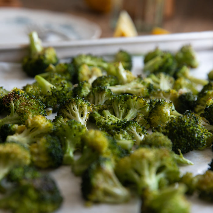 - Preheat oven to 400°F. Combine broccoli, garlic, olive oil, pepper, and salt to taste on a large baking sheet.