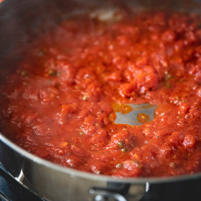 - In a large skillet, cook olive oil, garlic, tomatoes, parsley, capers, red pepper flakes, and oregano with salt to taste for 15 minutes.