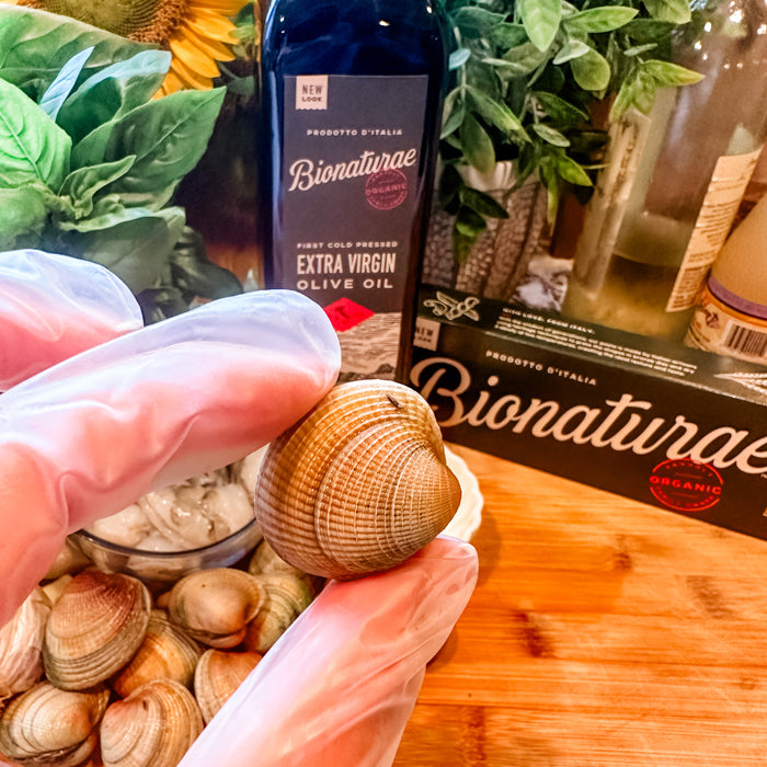 - Mash the garlic with a fork right into the oil. Then add the clams and cover the pan with a lid for about 4 minutes, until they start to open.