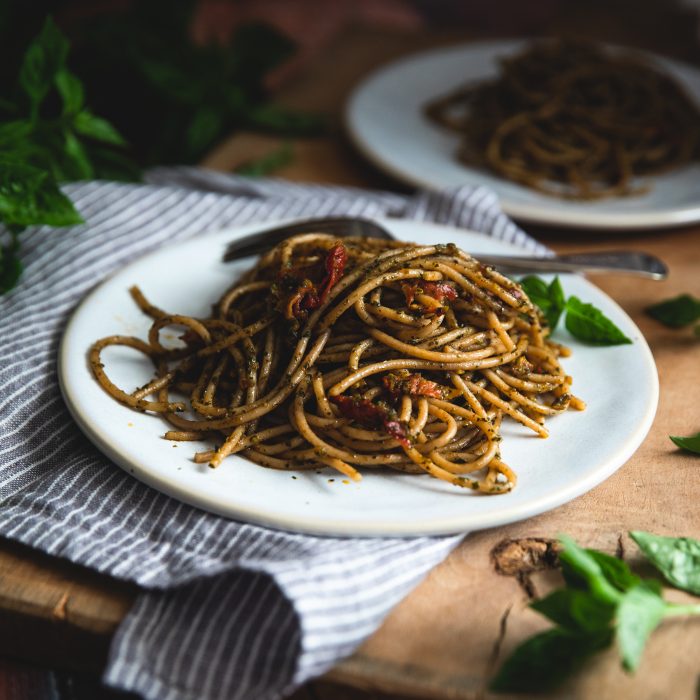Enjoy the authentic flavors of Tuscany with this pesto spaghetti recipe made with our organic Whole Wheat Spaghetti and Sundried Tomato Pesto.