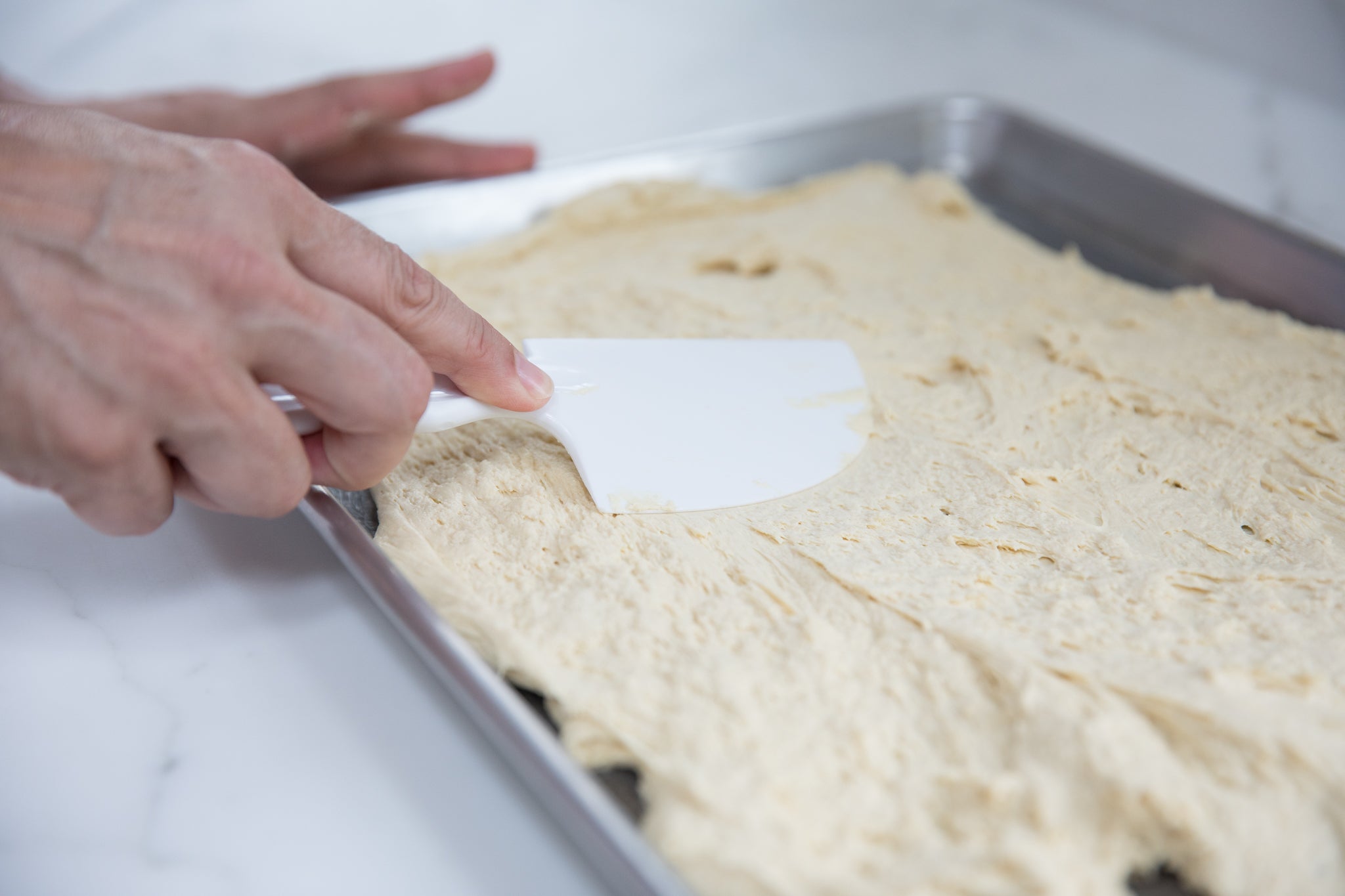 - Cover the pan tightly with greased plastic wrap and let rise for 30 minutes.
