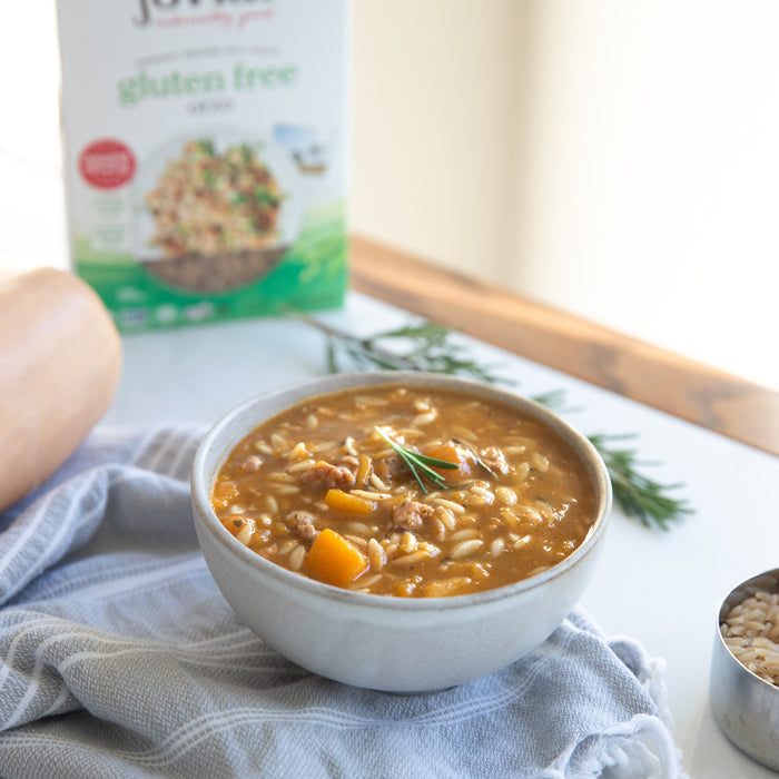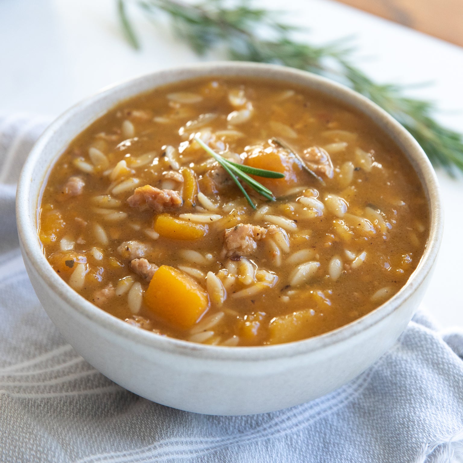 "Fall in a bowl" is how our test kitchen taste-testers described this recipe! We found a garlic sausage at our local butcher that perfectly balanced the sweet squash, but this flavorful soup will come out delicious with whatever kind of sausage you have available. You could even substitute the sausage for diced pancetta or omit it altogether! Either way, this warm and hearty recipe is exactly the sort of comforting meal you'll want after a long day of fall yard work or pumpkin picking.