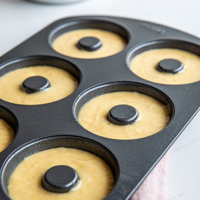 - Preheat the oven to 350°F. Thoroughly spray a donut pan with nonstick cooking spray and set aside.