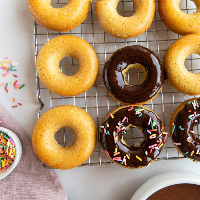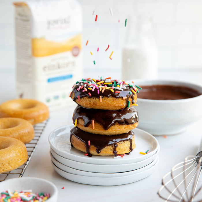 As irresistible as they look, these Einkorn Donuts are even more flavorful than traditional baked donuts, and perfect to serve alongside a cup of coffee or tea. Don’t be intimidated, this recipe is incredibly simple—if you can make cupcakes, you can make these! You’ll just need to have a donut pan, which is designed to keep the donuts’ shape while in the oven. We recommend topping your donuts with chocolate frosting, sprinkles, nuts, and/or shredded coconut, but they’re also delicious plain!