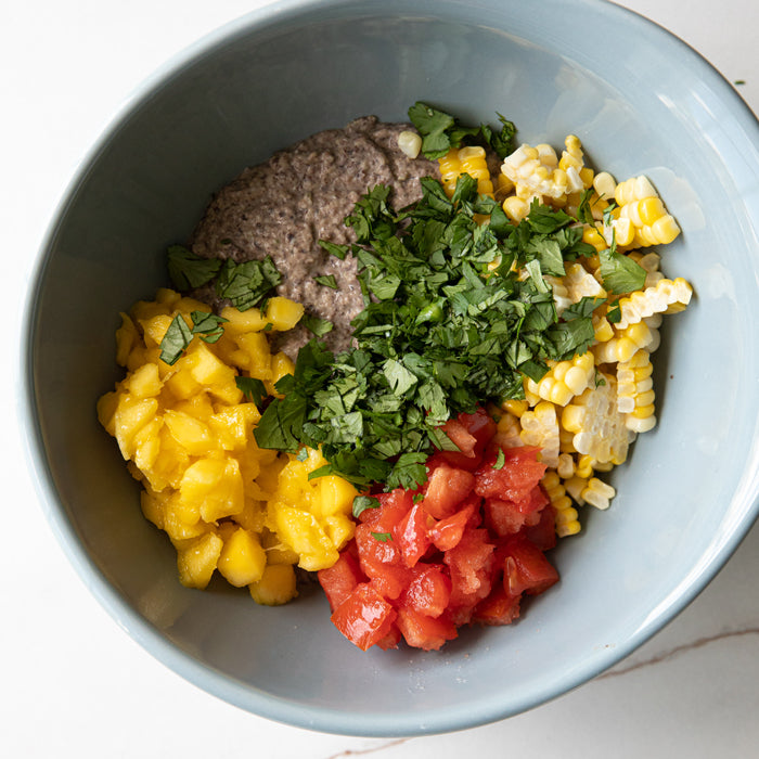 4. Chop the mango and tomato into bite-sized pieces, combine with blended mixture along with the corn and chopped fresh cilantro (I recommend keeping some of the fresh ingredients aside to use as a garnish). Serve chilled with tortilla chips.