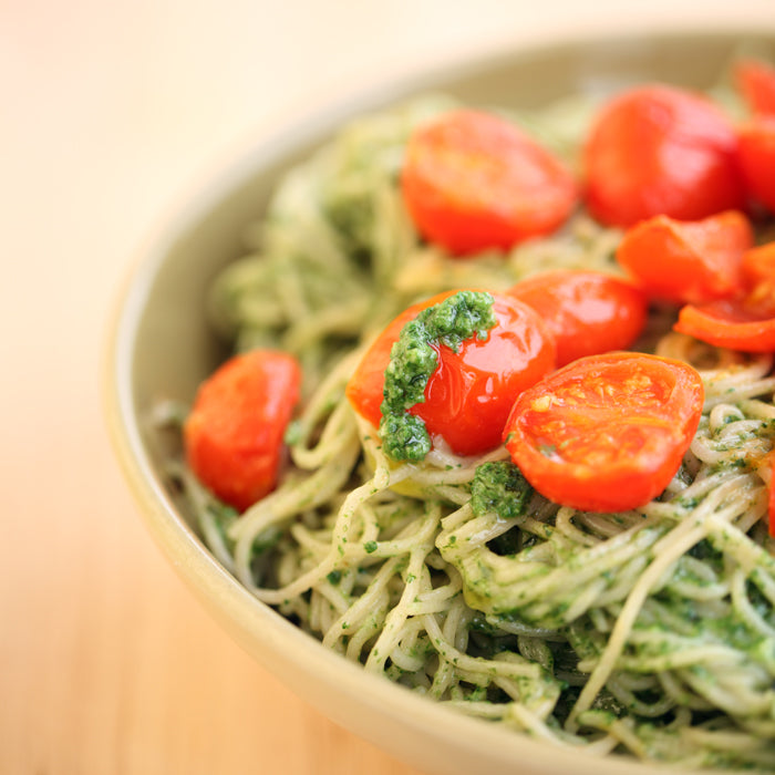 Try this delicious alternative to traditional pesto. You'll love the combined flavors of the spinach pesto and the roasted tomatoes and adding a little bit of spinach will make your pesto really green and it will be easier to puree.