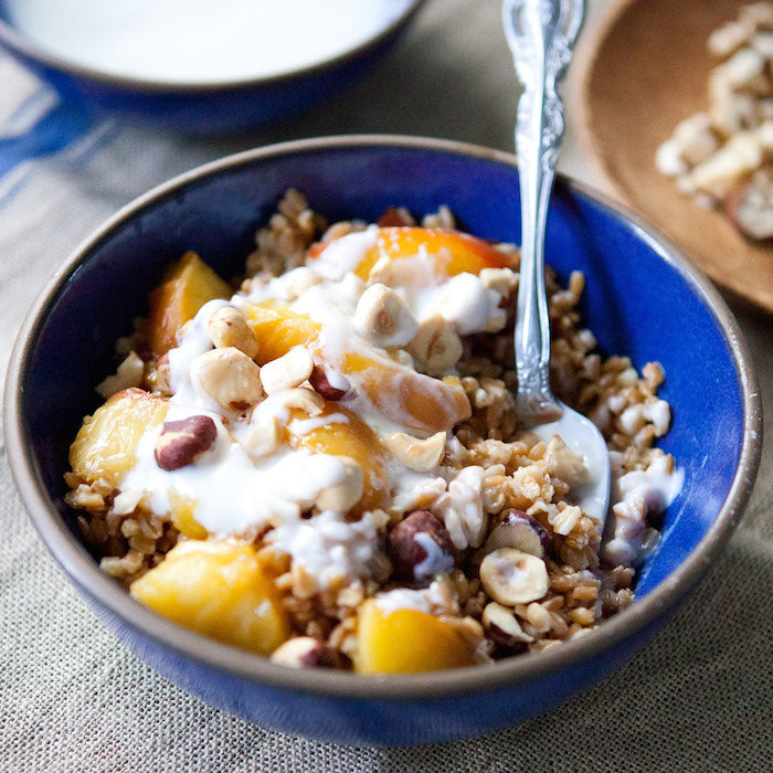 - To serve: Scoop a generous portion of cooked wheat berries into each bowl. Layer on peach slices and chopped hazelnuts, and spoon a few tablespoons of the honeyed yogurt sauce on top. Serve immediately.