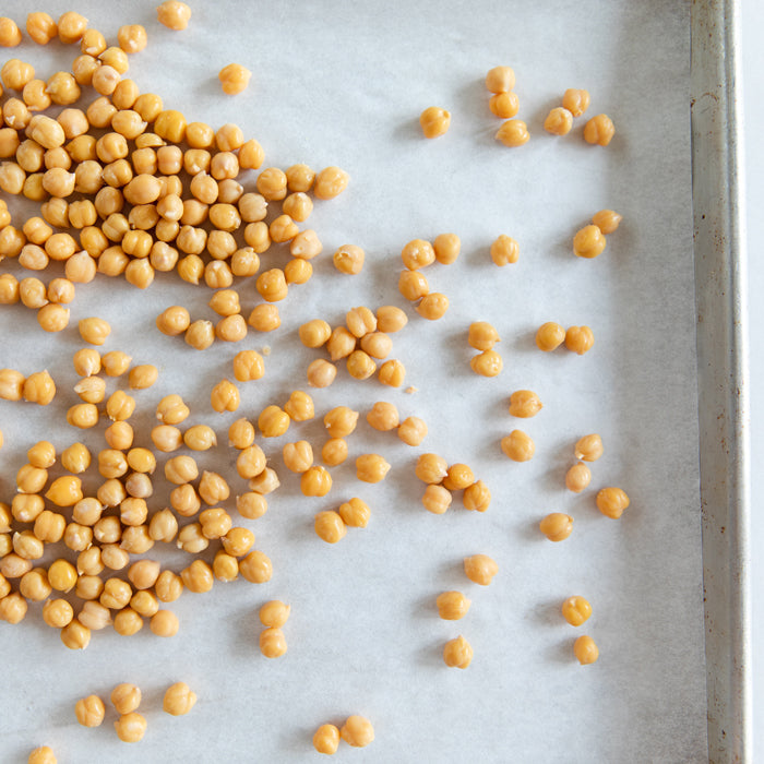 - Spread chickpeas out on a dry, clean towel and allow to air dry for 30 minutes. You want to be sure your chickpeas are completely dry before roasting. Remove any loose skins.
