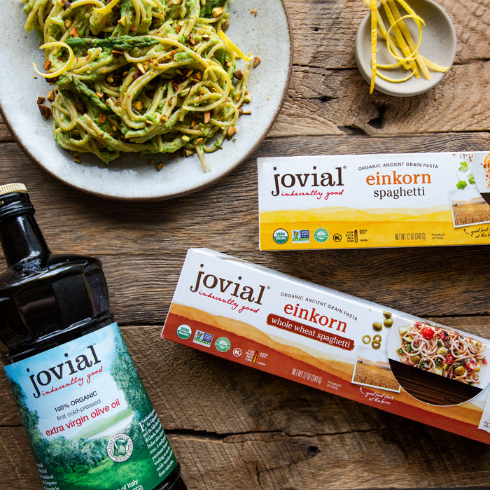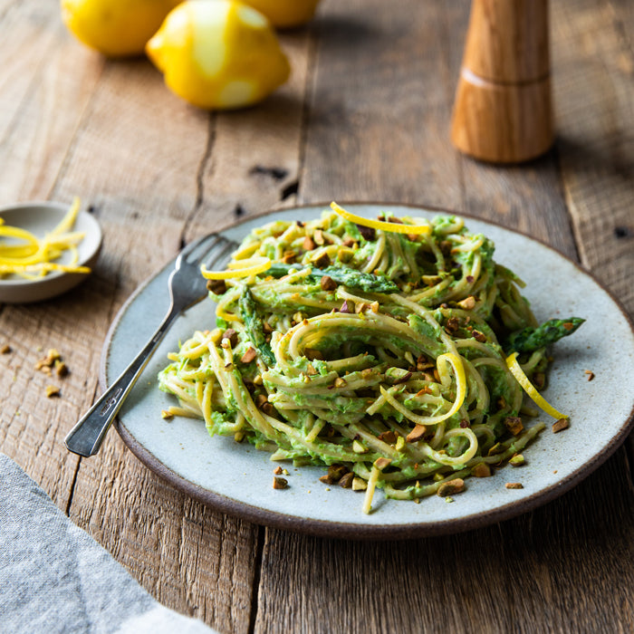 This delightful pasta dish celebrates the freshness of spring! For an extra light and velvety sauce, use an immersion blender to combine blanched asparagus and ricotta cheese with a tablespoon of our Extra Virgin Olive Oil—though most blenders and food processors will work! (As an optional garnish, you may also set aside a few tops of the asparagus spears to add at the end!) We used Einkorn Spaghetti for an addition of wholesome ancient grains in this recipe, but feel free to use your preferred variety of spaghetti. Toss with a bit of lemon zest for an extra burst of brightness, then garnish with salty chopped pistachios for the perfect added crunch!
