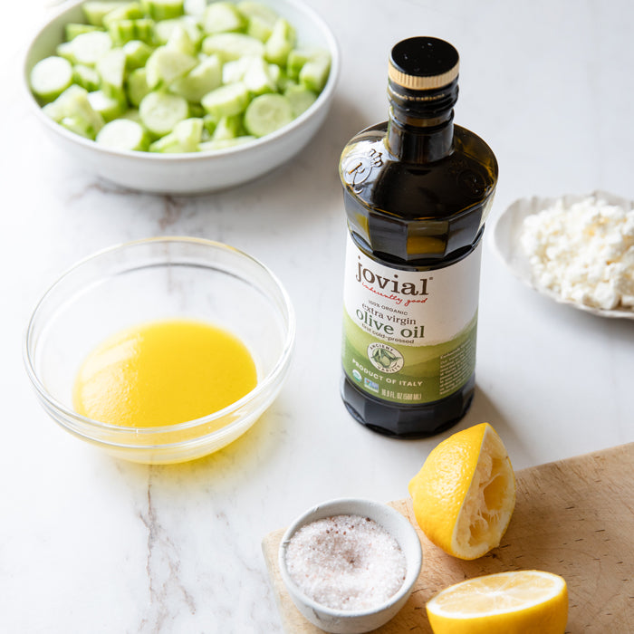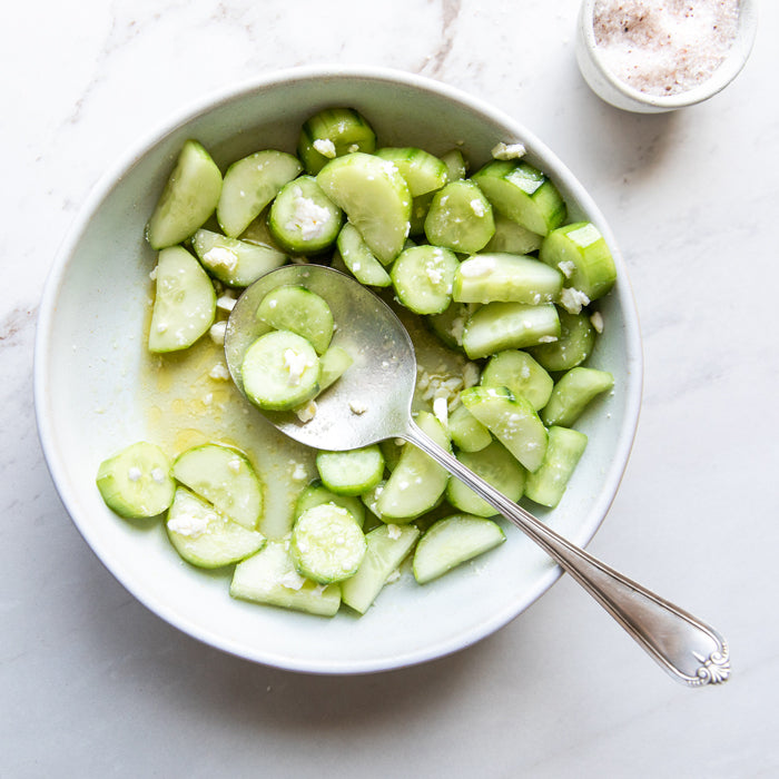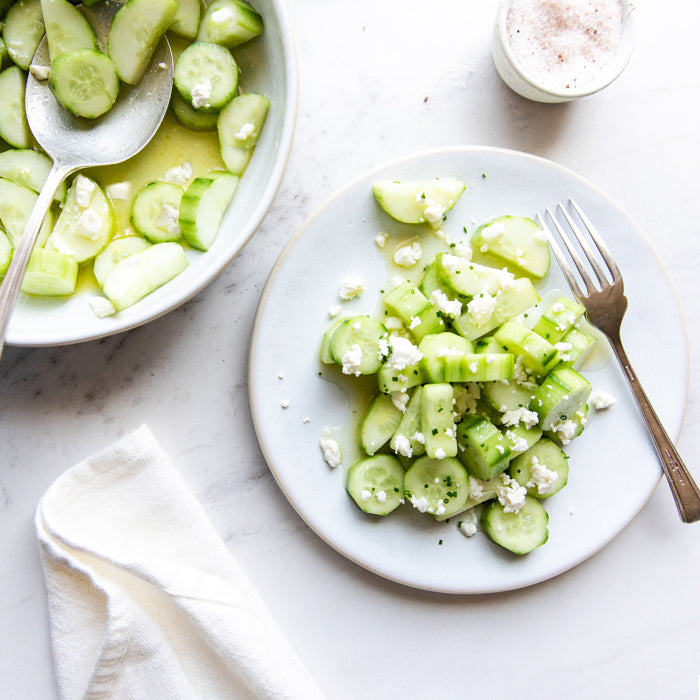 - Pour out any access water released by the cucumbers and then pour the olive oil mixture into the bowl. Top with crumbled goat cheese and toss together until all the cucumber pieces are coated in the olive oil mixture.