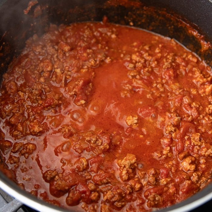 - Add 1-2 ladles of meat sauce to lightly cover the entire bottom of the pan.