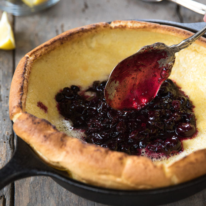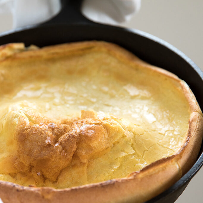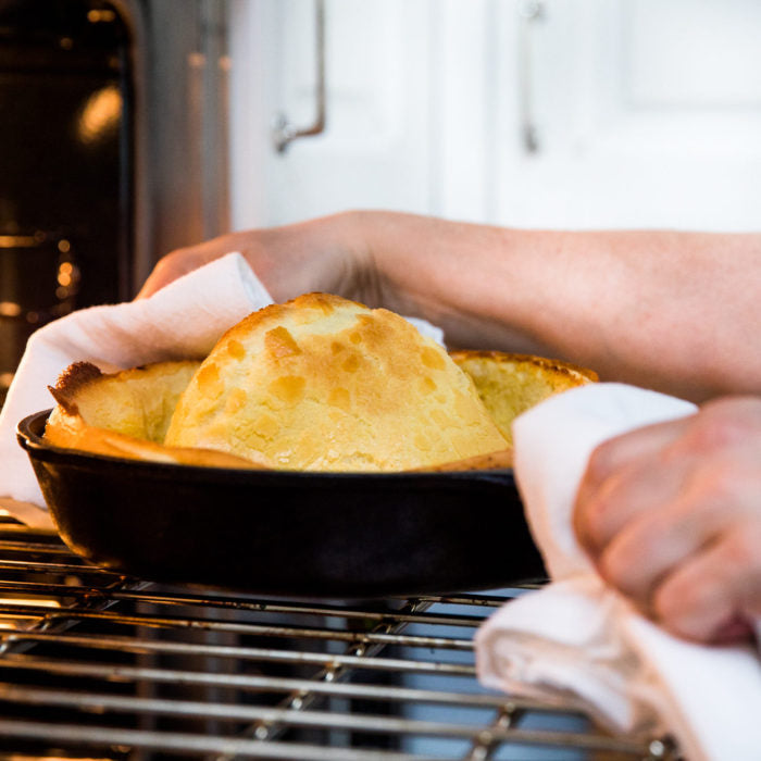 - Place a 10-inch ovenproof or cast iron skillet in the oven to heat for 5 minutes. Using oven mitts, remove the skillet and place on the stove. Add remaining 2 tablespoons of butter to the pan and swirl to cover the bottom and sides. As you pour the batter into the center of the pan, the edges will begin to sizzle from the melted butter.