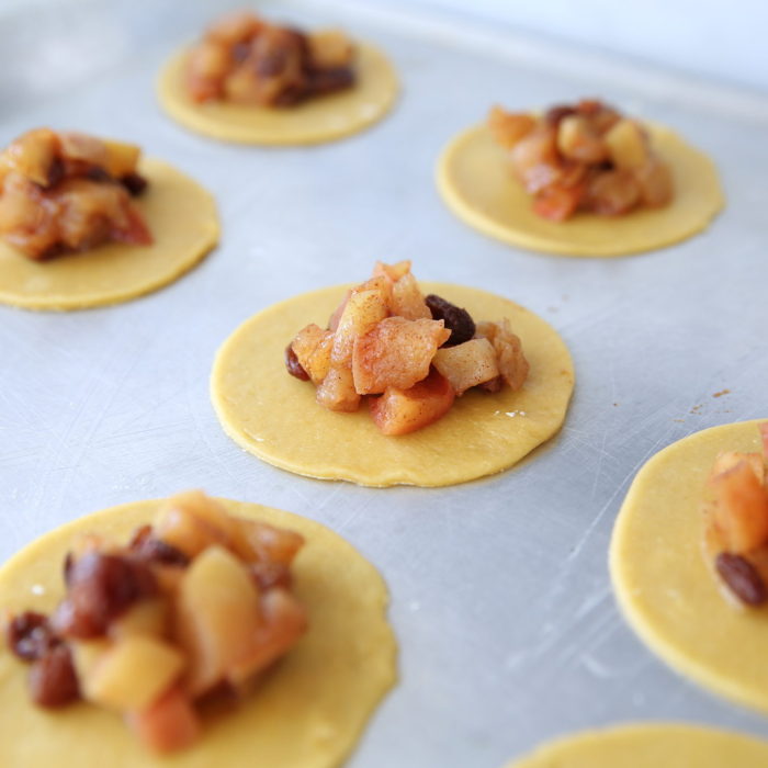 We’ve developed a special dough for the pies that stays firm when you pick them up, does not crumble when you bite into it, and is also buttery and flaky. The apple filling is lightly sweetened with honey, nicely spiced, moist, but it won’t leak out of your pies during baking. It’s a yummy chunky applesauce recipe that you can also enjoy all on its own!