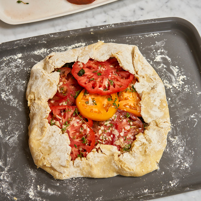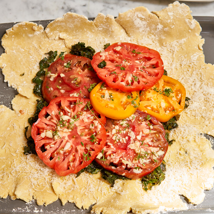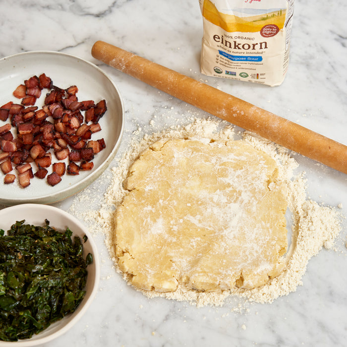 Recipe by GreenPan. This perfectly flakey crust, with a nutty and silky texture thanks our 100% Organic All-Purpose Einkorn Flour, gets wrapped around crisp bacon, heirloom tomatoes and lacinato kale to make a delicious galette that’s a fun take on the classic BLT.
