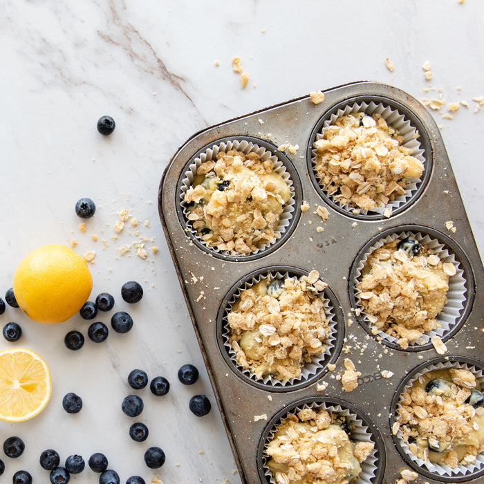 - Fill the muffin cups nearly to the top of the liner, and top with a spoonful of streusel topping.