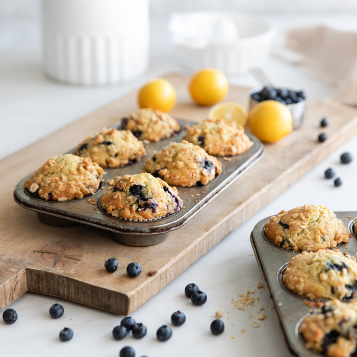 - Make the streusel topping: in a small bowl, combine the oats, flour, and brown sugar and stir to combine. Using your fingertips, work the butter into the dry ingredients until incorporated – the mixture should be chunky without any dry bits of flour remaining in the bottom of the bowl.