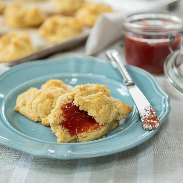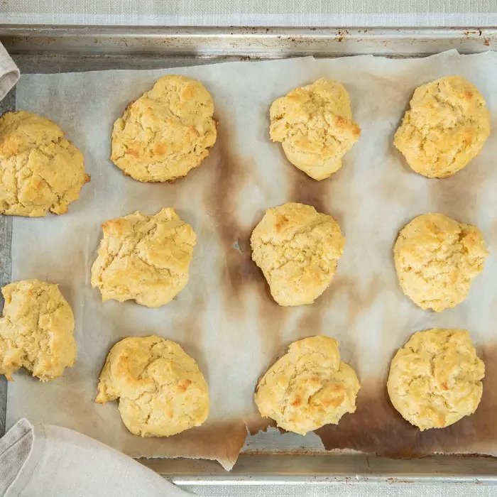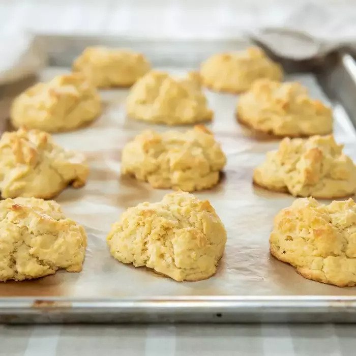 - Drop twelve 2 tablespoon mounds of dough onto a buttered baking sheet, spacing them 2 inches apart. Place a dab of butter on the top of each biscuit.
