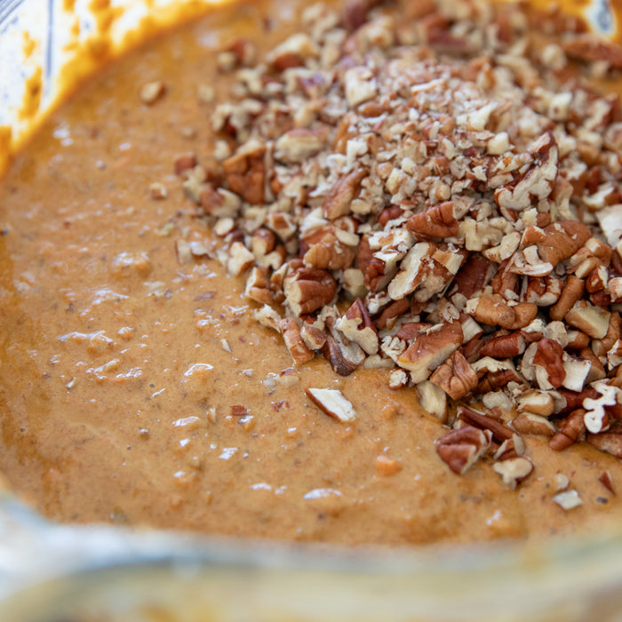 - In the bowl of a standing mixer, add the eggs and beat on medium speed for 1 minute. Add the brown sugar and increase the speed to high and beat for 3 minutes until light and fluffy. Using a spatula, fold half of the flour mixture into the sugar mixture and when it is almost completely absorbed, fold in half of the oil mixture. Repeat. Fold in the remaining 1 cup carrots in 2 batches, then fold in the chopped nuts.