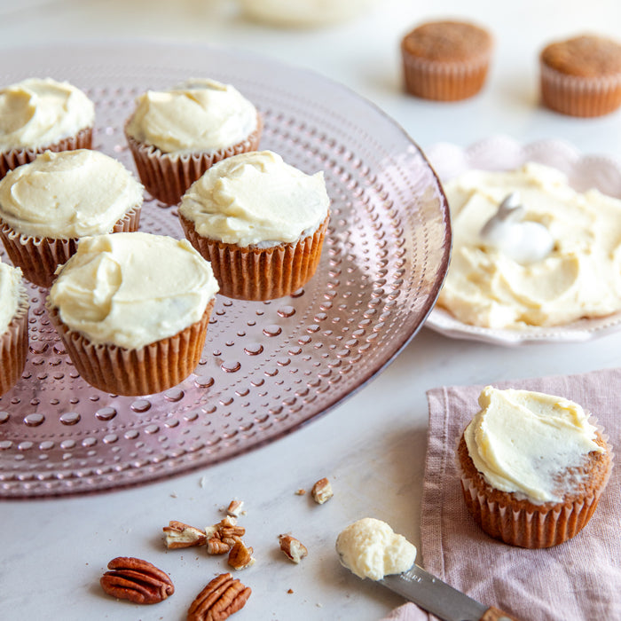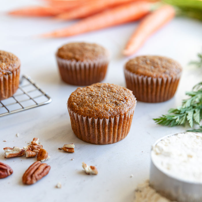 Buttery and dense Einkorn is a perfect match for the classic flavor and texture of Carrot Cake, which we’ve turned into cupcakes in this recipe! Going by taste, you almost wouldn’t believe that this version is lighter in sugar than usual, owing to the natural sweetness you get from pureéing half of the carrots with the raisins and olive oil to add to the batter. Our Extra Virgin Olive Oil gives these cupcakes a unique depth of flavor, one that can only be described as “Italian,” and must be tasted to understand! Serve them with or without the cream cheese frosting—they’ll be moist and flavorful either way.