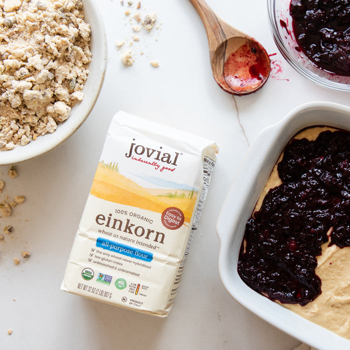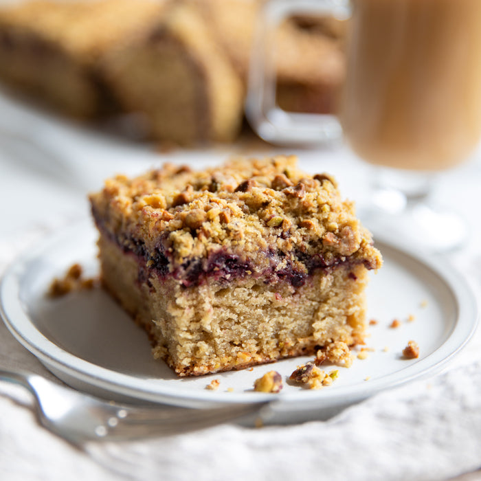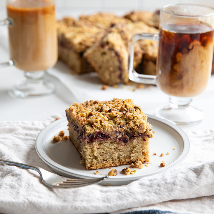 In this recipe, salty-sweet pistachio streusel and fresh cherry jam top a layer of rich einkorn cake. This coffee cake is wonderful if you’re having people over for brunch or for a special occasion, but it’s also quite simple to pull together just because. If you prefer other nuts rather than pistachios feel free to swap them in, and if you’re pinched on time you can use 1 ⅓ cups of your favorite chunky jam in lieu of making the cherry filling.