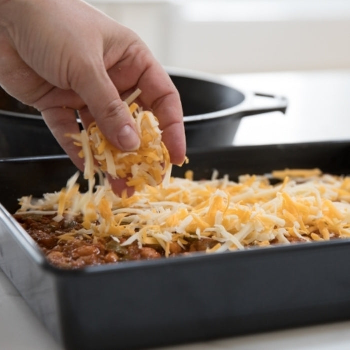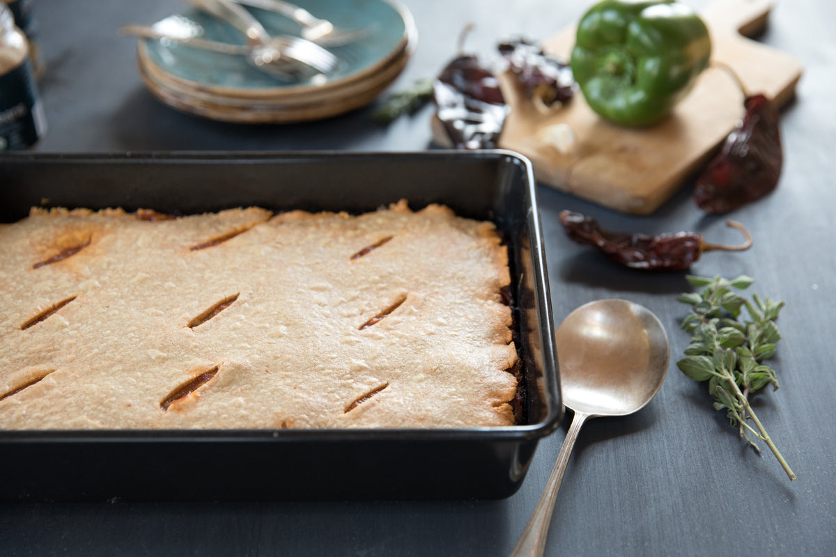 - To assemble the pie, remove the dough from the refrigerator. On a floured piece of parchment paper, roll the first piece of dough into a 9 x 13-inch rectangle, lifting and turning the dough with each roll. Place the dough in the bottom of a 9 x 13-inch baking pan. Pour the chili into the dish, then spread the shredded cheese evenly on top.
