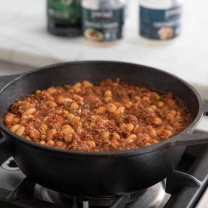 - Stir in the crushed tomatoes and cook on medium-low heat for 20 minutes until reduced and thickened. Add the beans with their cooking water and cook for 5 minutes more. Turn off the heat and allow the chili to cool.