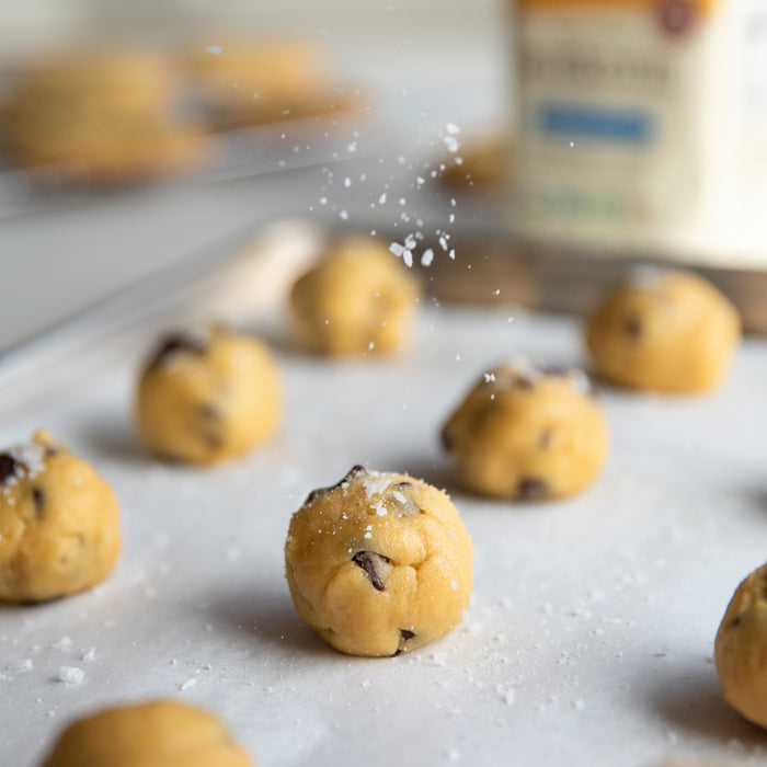- Scoop generous 2 ½ tablespoon balls (1½" in diameter) onto the baking sheet, leaving 2 inches between each. Sprinkle the dough balls with flaky sea salt, if desired.