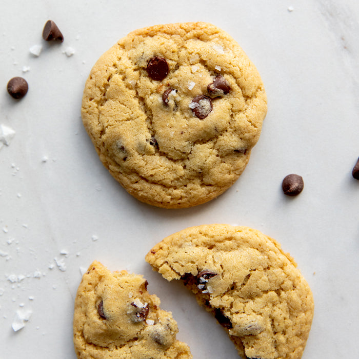 Our test kitchen found that these cookies were optimally baked when they appeared a bit more done than you would normally bake a modern wheat chocolate chip cookie for, but not overdone! Watch carefully for the edges to be lightly golden brown. We love to finish these cookies with a sprinkle of flaky sea salt before they go into the oven, but that is completely optional; they're delicious without!