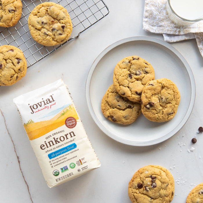 While there are many types of chocolate chip cookie recipes, finding a classic, no-fuss go-to using einkorn flour isn’t simple...until now. These cookies are soft and chewy with ample chocolate chips, and come together quickly—no dough resting in the fridge needed!