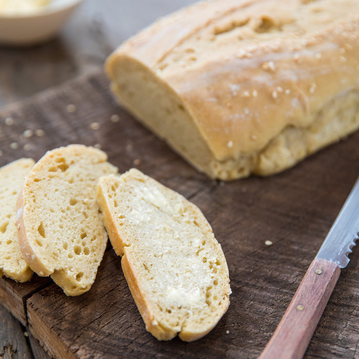 - Uncover the loaves and cut one ¼-inch deep slash down the center of each loaf, being careful to not cut too close to the ends. Brush the tops with water and sprinkle each loaf with sesame seeds. If you are not using sesame, place the bread in the oven after slashing and do not brush the dough with water.