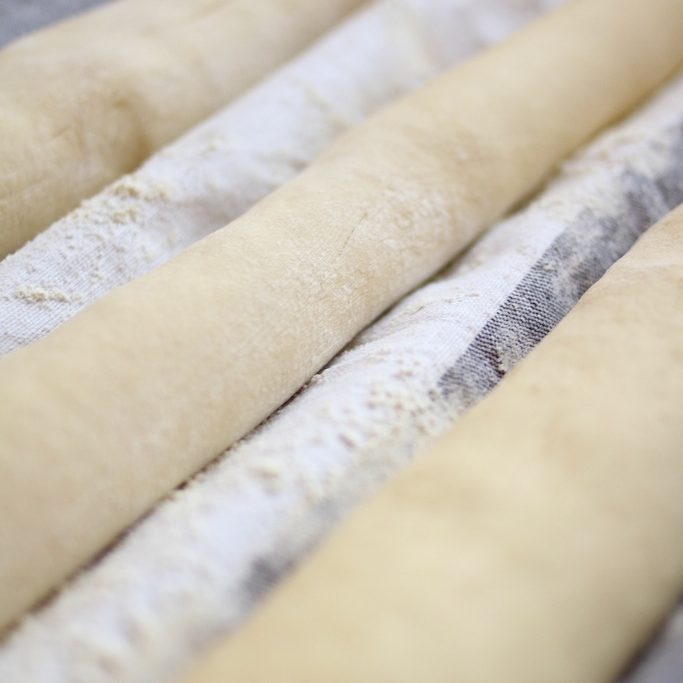 7. If you are using a baguette pan, place a clean cloth dusted with flour on top with the long ends hanging over each side. Place each baguette in place, then fold over the ends to cover. Let stand for 30 minutes for the yeast recipe and 60 minutes for the sourdough before baking. If you do not have a baguette pan, you can place the loaves inside the folds of a thick kitchen cloth that have been dusted with flour.