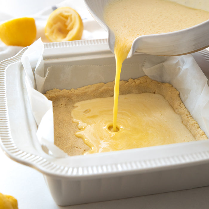 - Once the crust is done par-baking, pour the lemon filling into the pan and bake for 25-30 minutes, or until the center of the bars is set.