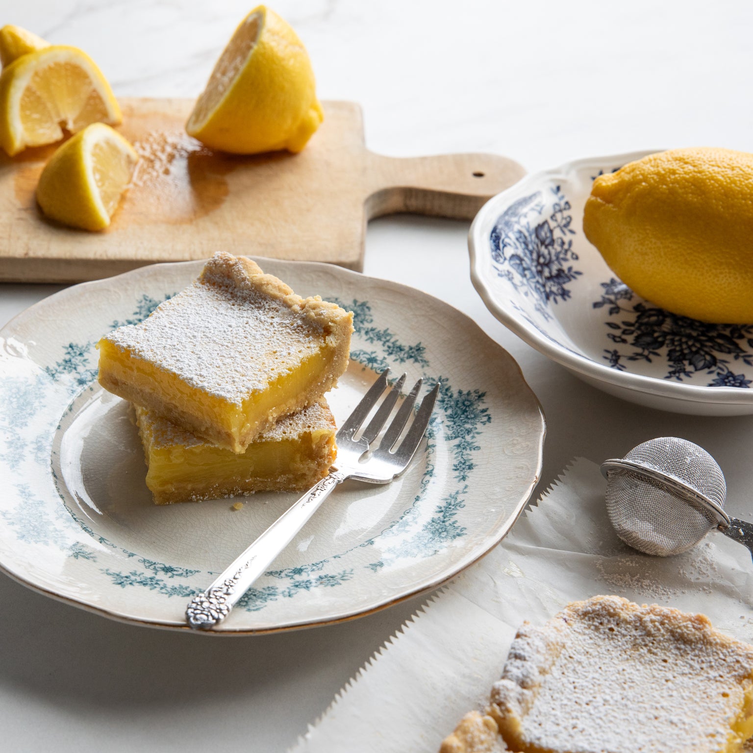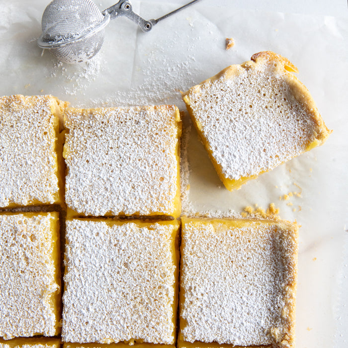 - To serve: Remove bars from pan by lifting up on the parchment overhang. Set on a flat surface and slice into squares. Dust with sifted powdered sugar.