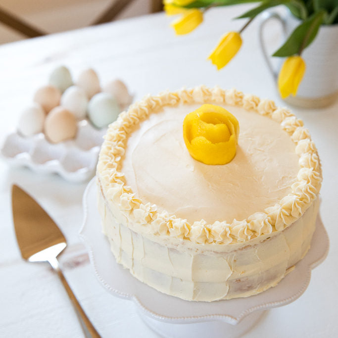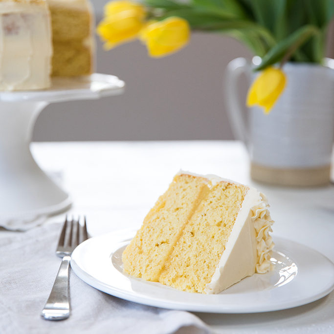 2. To assemble the cake, place one layer on a 10-inch cake dish or cake stand and tuck small strips of parchment paper around the edges of the cake to keep the dish clean while you frost the cake. Spread all the lemon curd evenly over the bottom layer. Place the second layer over the lemon curd and press down gently. Thinly spread half of the frosting on the sides of the cake. Spread the remaining frosting on the top of the cake. Remove the parchment paper strips and serve.