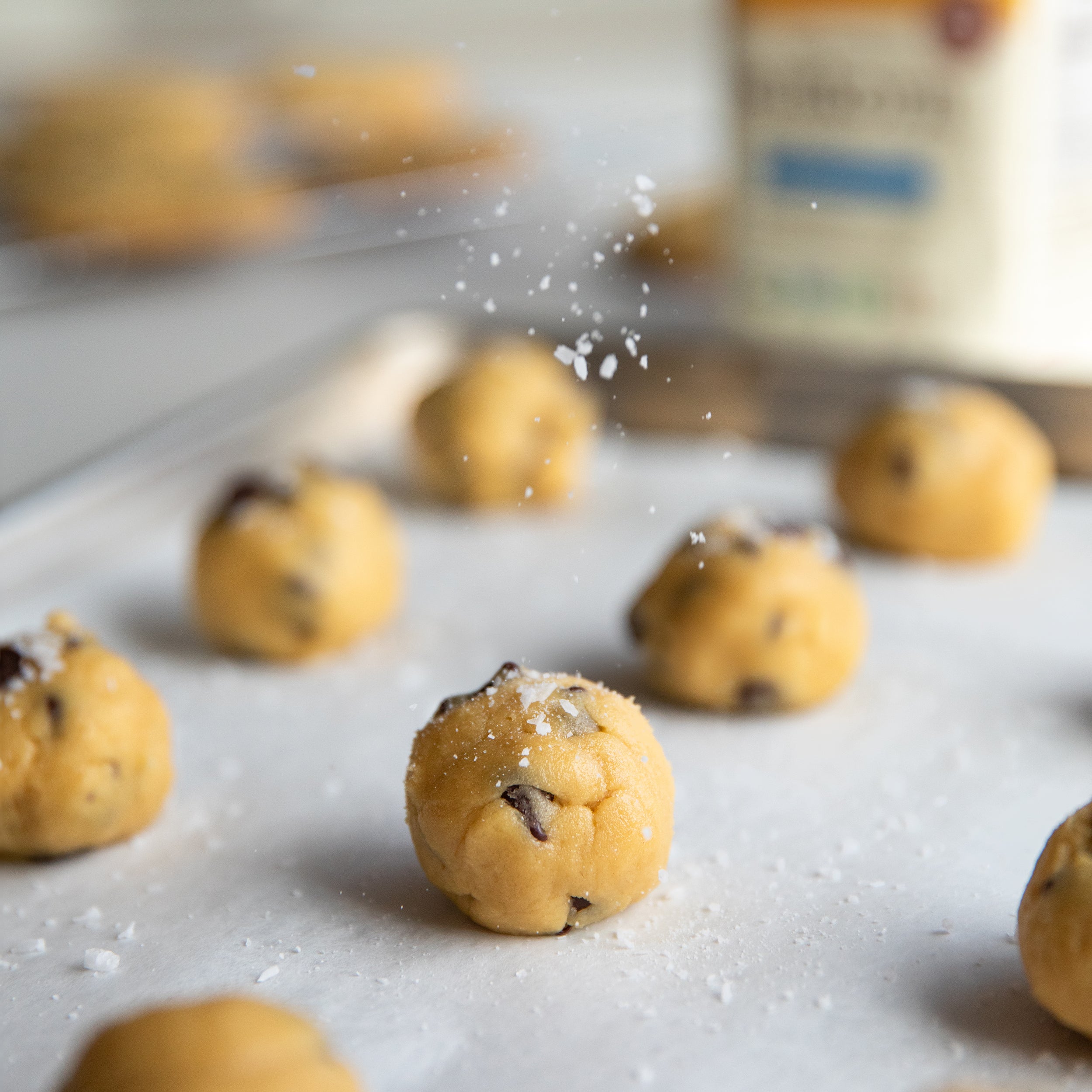 - Roll 2 tablespoon (30 g) scoops of cookie dough into balls and place on the prepared baking sheet, leaving 2-inches around each cookie.