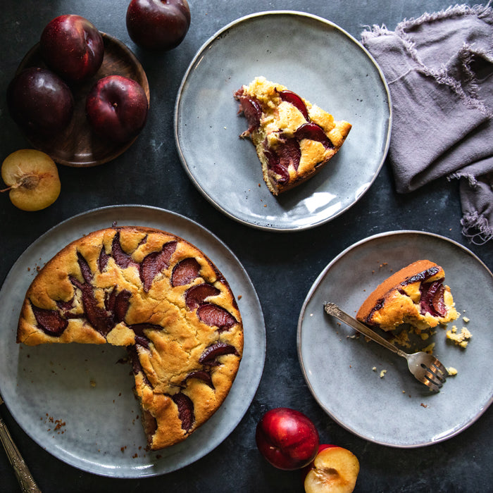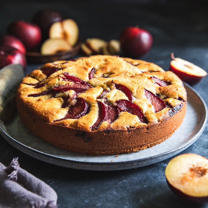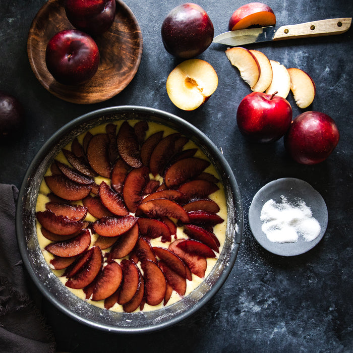 - Drain the plums from the wine mixture and distribute onto the cake in ring shapes, starting from the outside until the whole surface is covered.