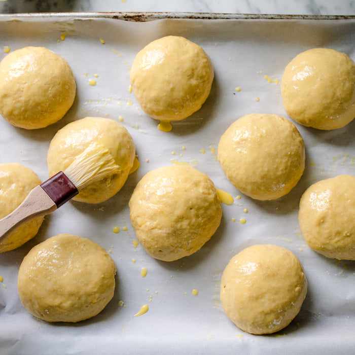 9. Combine the egg wash ingredients in a small bowl. Brush the risen buns with the egg wash.