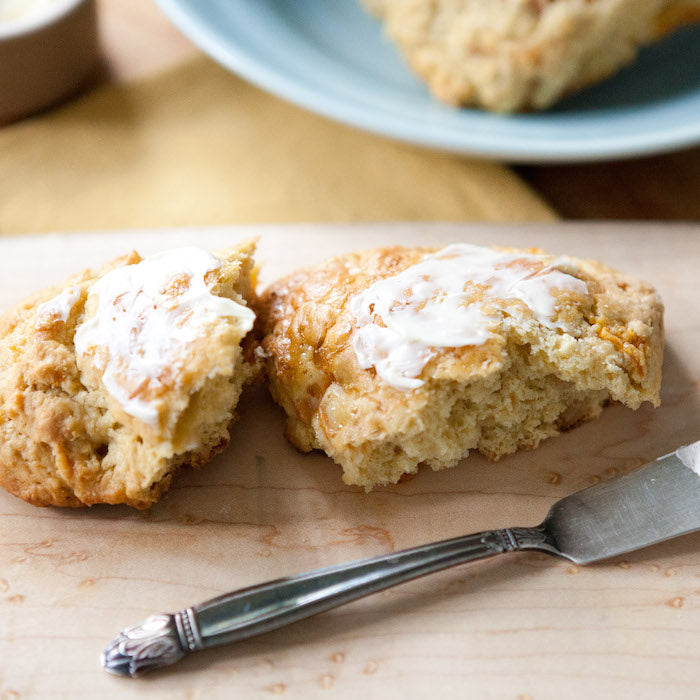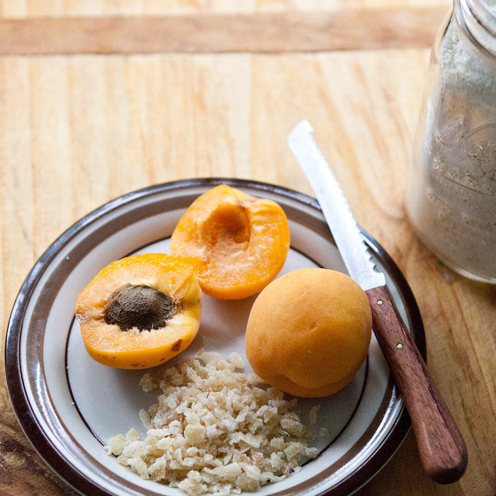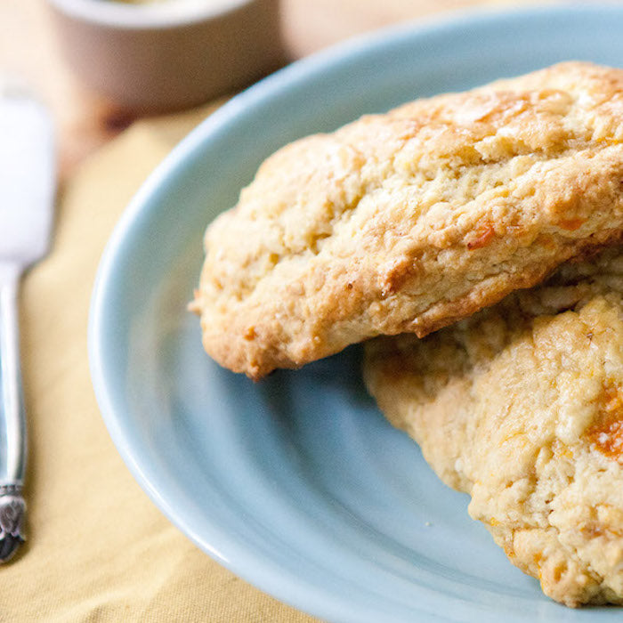 - Using a pastry blender or your fingertips, work the butter into the flour until it resembles a coarse meal. Gently fold in the apricot pieces and crystallized ginger.