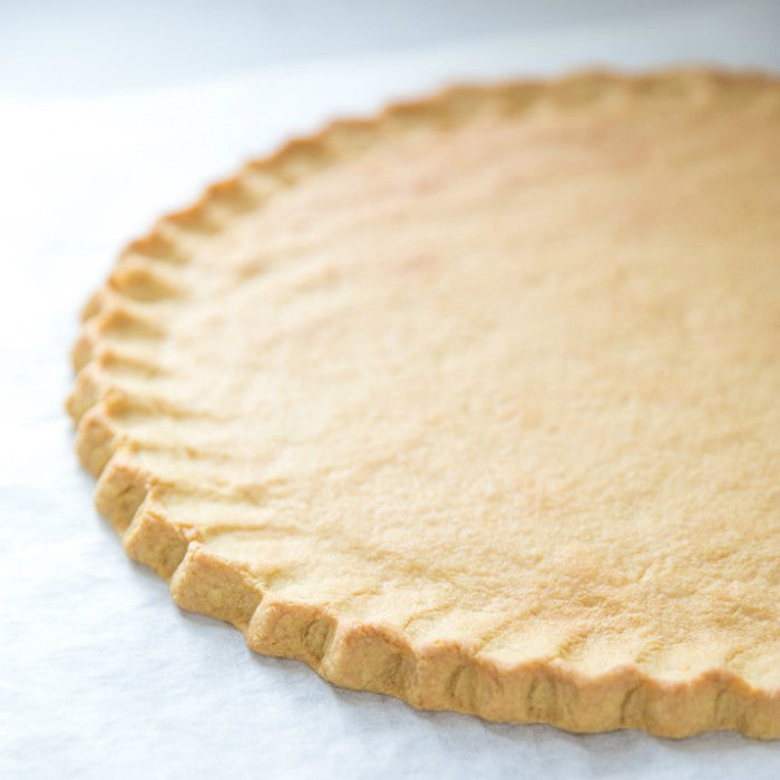 3. Place the dough between two pieces of parchment paper, dusting the paper and the top of the dough lightly with flour. Using a rolling pin, roll out the dough to a 12-inch circle. Crimp the edges of the cookie with your fingers to create a raised border.