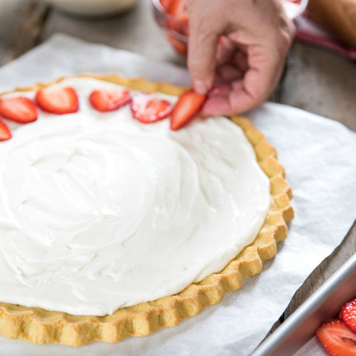 2. Add the cream to the center of the cookie. Using an offset spatula, evenly spread it to the inside of the crimped edge. Arrange the strawberries on top of the cream.