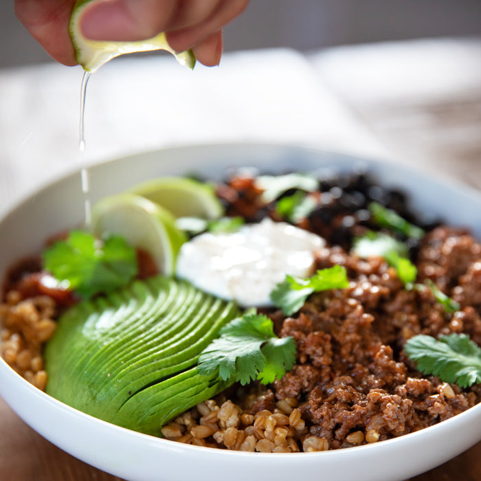 - Once all components are cooked, assemble your bowl by placing about a cup of wheat berries at the bottom of a shallow bowl or pasta dish. Then top with beef, beans and any other toppings you like. Some of our favorites are salsa, avocado, sour cream, fresh lime, and cilantro.