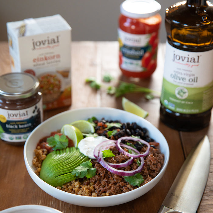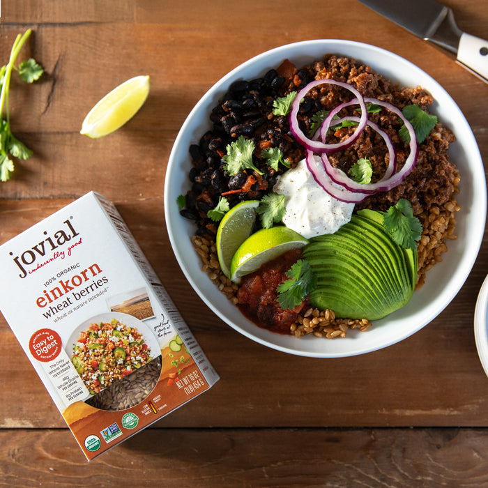 Recipe by Giulia. Playing with a variety of flavors and textures is what makes for a truly great bowl, and this vibrant Einkorn Wheat Berry Taco Bowl is no exception! With plump and hearty Einkorn Wheat Berries creating a base for the savory beef and beans, they also pack in protein, essential minerals, and a delicious nutty flavor. Top it all off with your favorite garnishes like avocado, cilantro, salsa, and a squeeze of fresh lime juice for a comforting and satisfying meal!