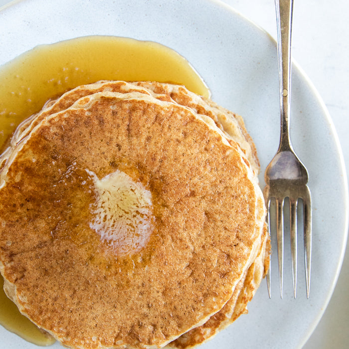 Mix up sourdough starter, warm milk, flour, salt, and sugar in the evening and let the batter sit out for a few hours to get the rise going, then let the mixture rest in the refrigerator overnight. When you wake up in the morning, whisk in eggs and you're ready to cook up these delicious Einkorn Sourdough Pancakes. Sourdough pancakes have a more complex flavor than regular pancakes, and are easier to digest. However, they are not quite as fluffy, unless your starter is very active. After cooking up the first pancake, if they do not rise as much as you would like, whisk baking powder in the batter. For a better rise, it helps to refresh your starter before you mix up the batter, but you can also mix these up with starter right from the refrigerator. If your kitchen is cold, you might also need to leave the batter out to rise for a little longer than 3 hours before refrigerating. On the other hand, if your starter is really active, two hours out at room temperature may be enough to get the fermentation process started. Judging the timing will be different for everyone.
