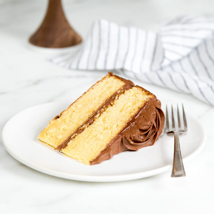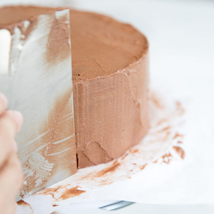 - Slice the cake in half horizontally with a long serrated knife. Place the bottom layer on a rack over a baking tray. Spread ¾ cup of frosting evenly over the bottom layer with an offset spatula. Place the second layer on top. Spread the frosting around the sides and top of the cake then smooth with a spatula. Add a decorative rope pattern around the edges of the cake with a pastry tip, if desired.
