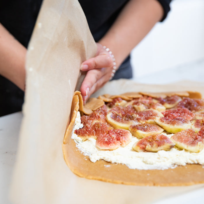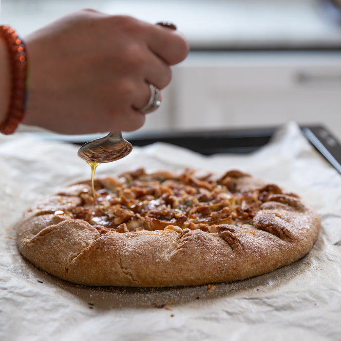 Galette recipes have been a favorite in our company’s history—you can’t go wrong wrapping sweet and tart flavors into a flaky einkorn crust. What makes this version unique is the combination of salty goat cheese and thyme with fresh October figs. Plus, galettes are rustic by nature, which means they are so simple to create a truly beautiful dessert. Add a drizzle of honey to your finished pie, and you’ll have a real crowd-pleaser!
